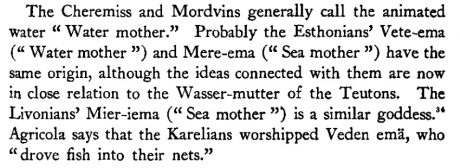 To my delight, as I was writing this unit, I located on the Internet the PDF of a book I have been trying to find for a good many years: The Mythology of All Races, Vol. 4, 1927: Finno-Ugric, Siberian, by Uno Holmberg. Now, the Maine professor will not go into his odd craving for Finno-Urgic folk-lore—such a disclosure might take a salacious turn that recalls certain indiscrete allusions to Latina nooky during the GNE—but he does assure you of the savory flavor of this genre. The book is currently unavailable, though I have managed to purchase almost all of the 13 volumes of The Mythology of All Races, which can be found in the Ambergane Library and Archives. It is of course a standard reference for Nemeta.