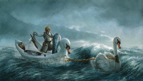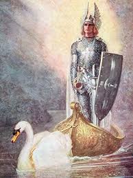Here you see a typical romanticized version of Lohengrin, the Knight of the Swan.