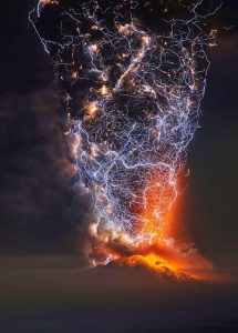 Long exposure photo of lightning at play in a volcanic eruption in Chile, February 2018