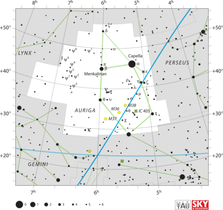 The constellation of Auriga, the Grail King. The blue line from +20 to +20 is the ecliptic. The moon appears either five degrees above or below this line, hence in the BULL or TWINS. Auriga shares the star El Nath at the foot of the Grail King with the BULL, marking the tip of the upper horn. This is the star of Morbido.