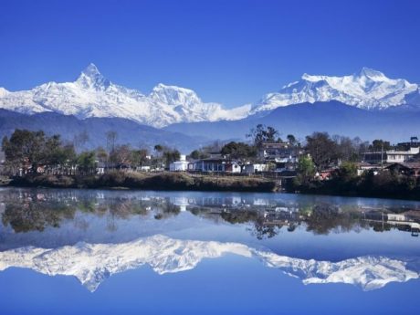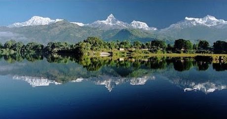 The Pokhara Journal was written at the lake of Phewa Tal. The little house where I hide away at that time appears here at the near center of the photograph, vertically positioned beneath the arrowhead peak of Machapuchare. It was under construction, intended to be tourist reception office.