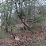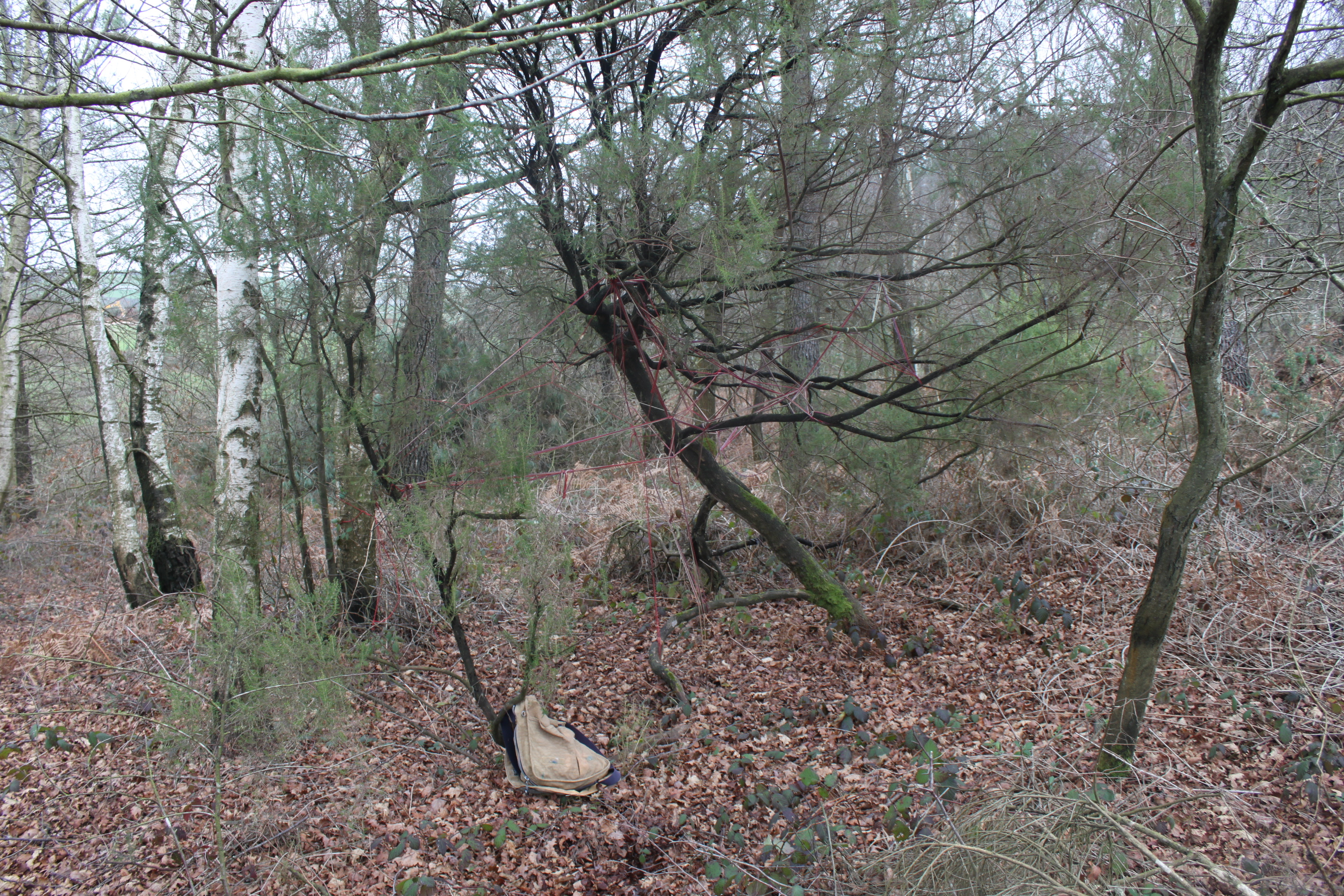 At the grove the greyness of the ambient light is palpable. The air is totally still. Cording bag on ground
