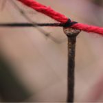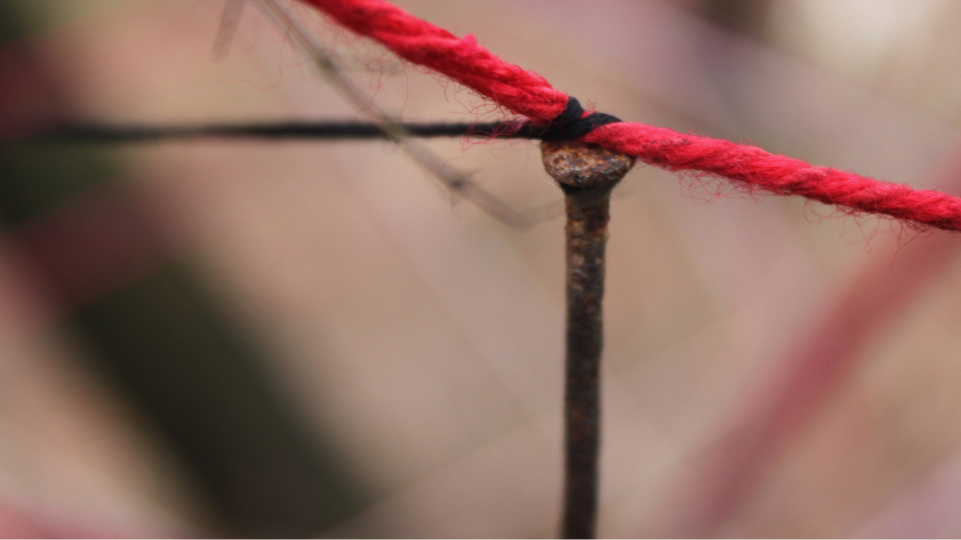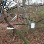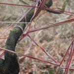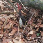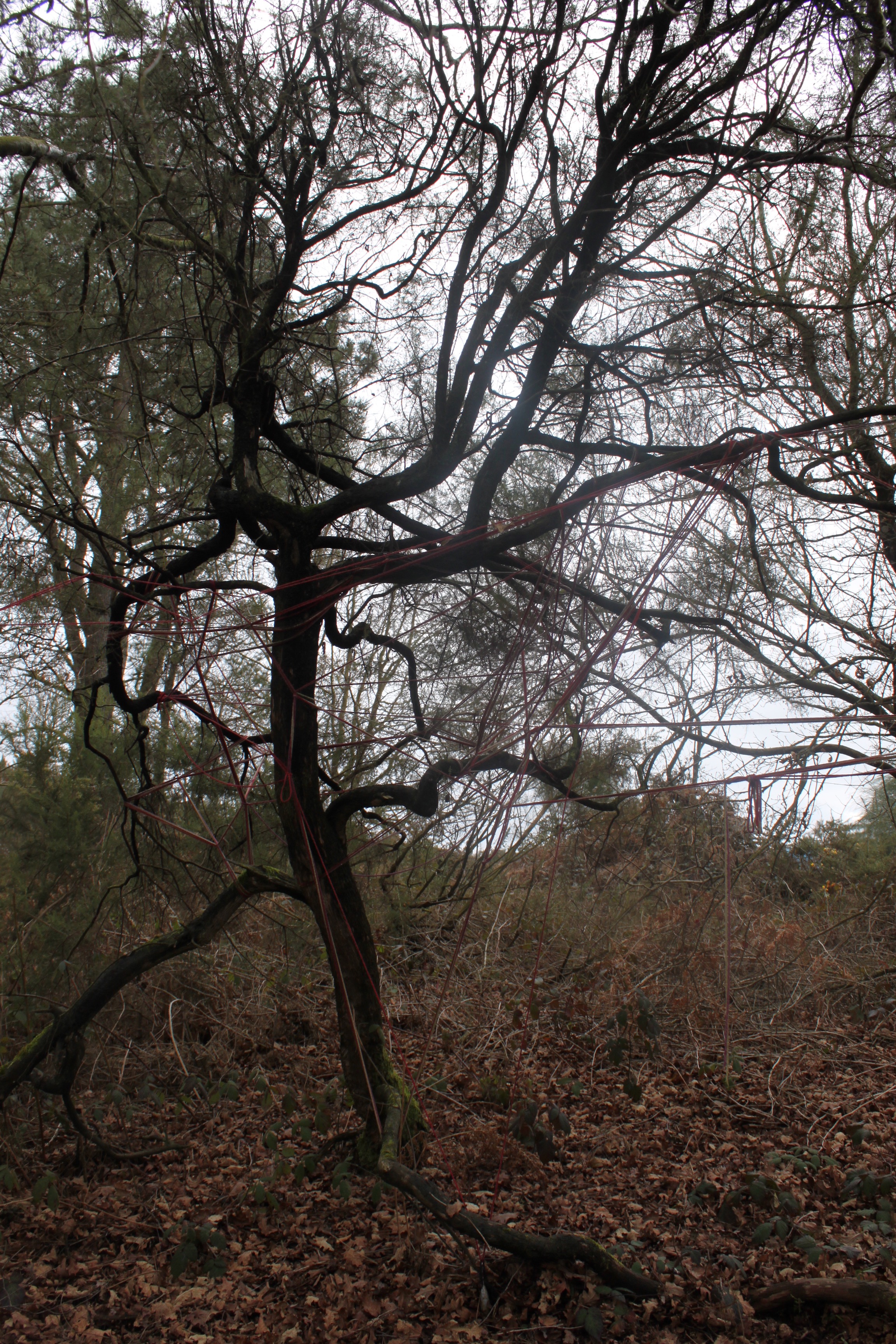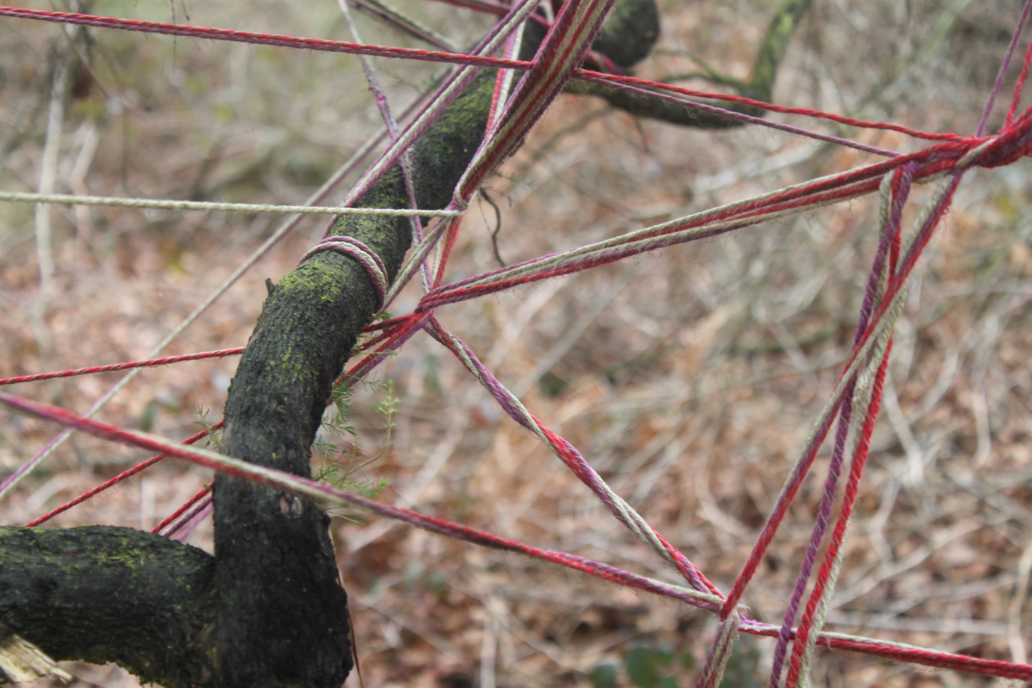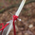 Supplementary cording for closure with SC app fixed to tree. The feathered cord hangs down to the place where I rapped the root with my knuckles. Red V of the sinker line.