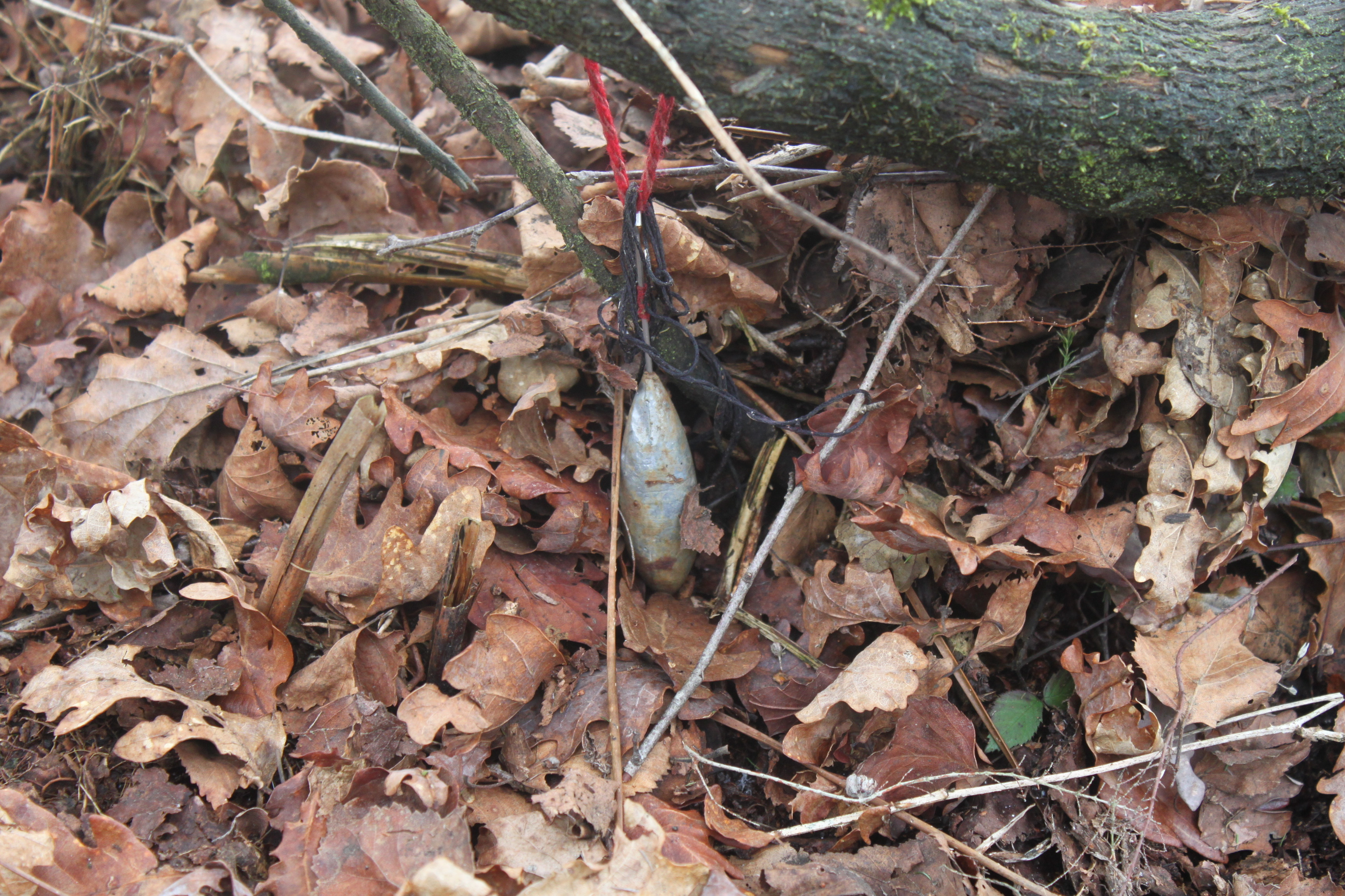Sinker nestled in a bed of wet leaves, original sinker cord (red)