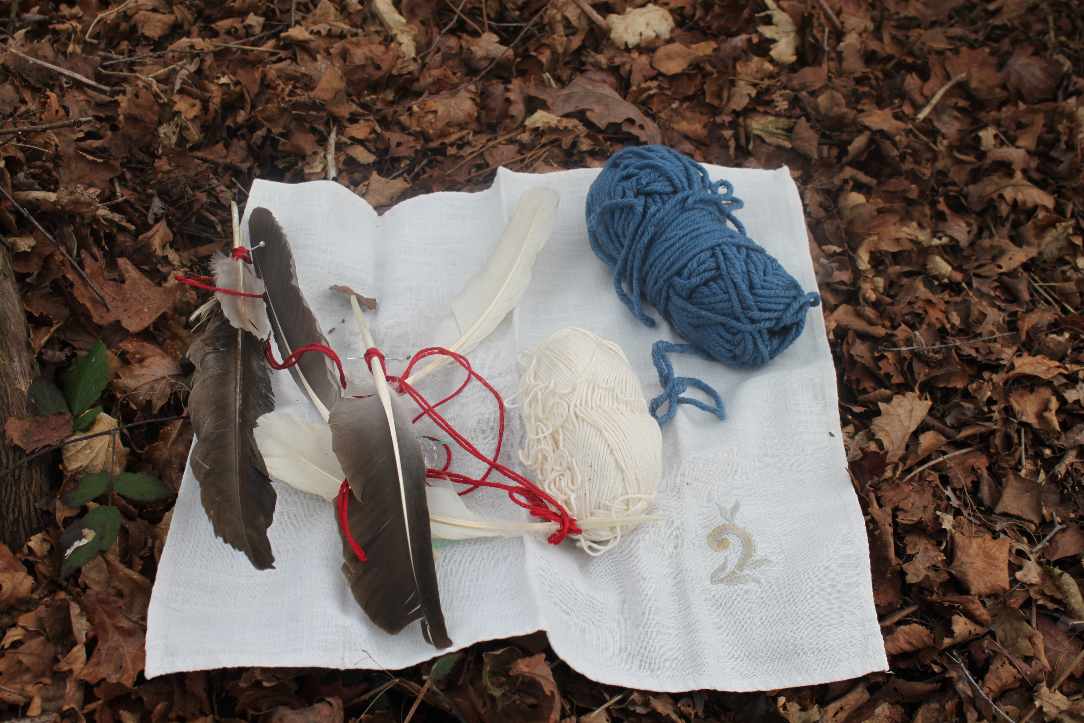 Materials for supplementary cording: vulture fathers from the Serrania de Ronda and two white owl feathers plus pin feather. Red, white, and green cord.