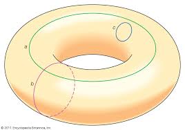 Topology of a surface area. Note that the illustration shows a “sheet” to be conceived as having two sides but no edge. The planar dimension of S-2, surface space, is intact and unbounded. As you look around you and scan the properties of the world-event, S-2 is a topological maze of shapes defined by surfaces, and you cannot go through any surface into what lies beneath it. The second common image of topography is the toroid or donut: